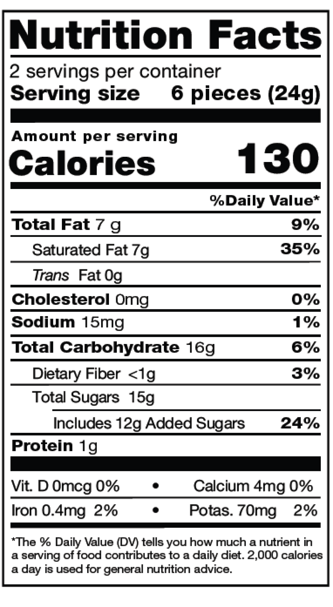 Ingredients: Sugar, Hydrogenated Vegetable Fat (Palm Kernel Oil), Whey Powder, Alkalized Cocoa Powder, Emulsifiers (Soy Lecithin, PGPR), Vanillin.