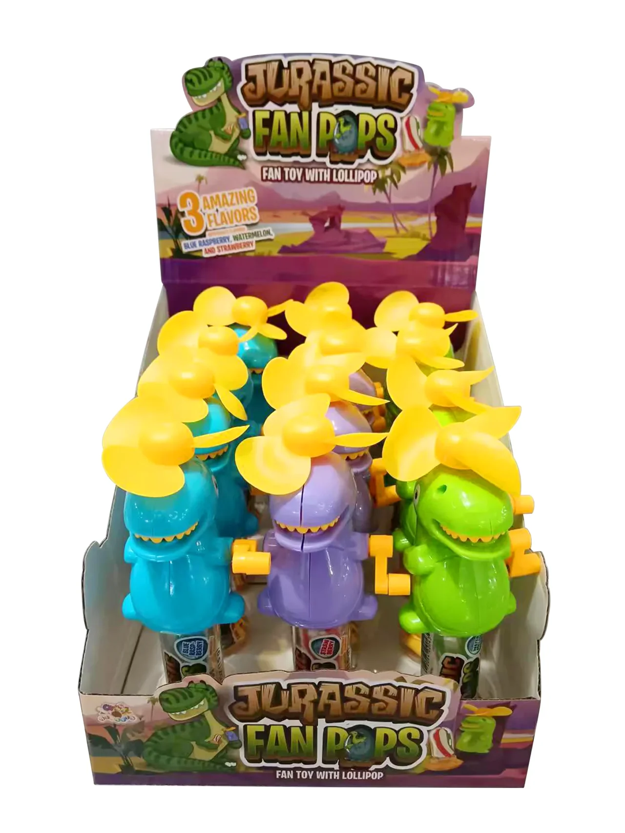KIDS WILL LOVE THESE TOO! Our Jurassic Fan Pop is sure to be a cool addition to your candy novelty set.Each unit contains a delicious lollipop in three fruity flavors.Wind up the hand crank to see the fan spin and cool you off. Flavors include Blue Raspberry, Watermelon and Strawberry. Suitable for ages 3 +.