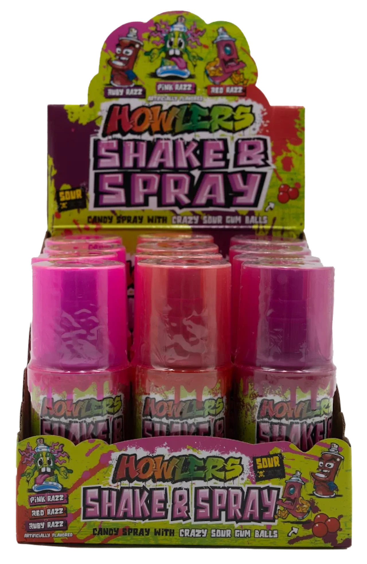 Love the sound that a can of spray paint makes? Now you can have the same experience with the candy version in Shake & Spray. The top of the “can” is filled with delicious Sour Spray in your choice of Blue Raz/Blue Raspberry, Green Raz/Green Apple, Purple Raz/Grape. The bottom compartment houses three super sour Blue Raspberry gumballs. Get ready for a flavor explosion with Albert’s Howlers Assorted Shake and Spray!