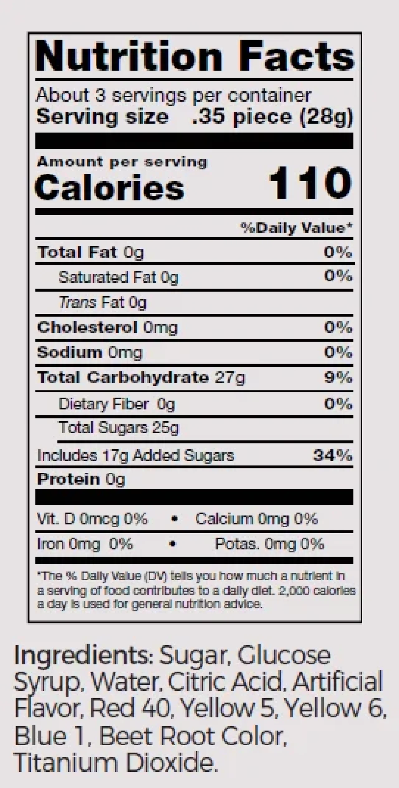 Ingredients: Sugar, Glucose Syrup, Water, Citric Acid, Artificial Flavor, Red 40, Yellow 5, Yellow 6, Blue 1, Beet Root Color, Titanium Dioxide.